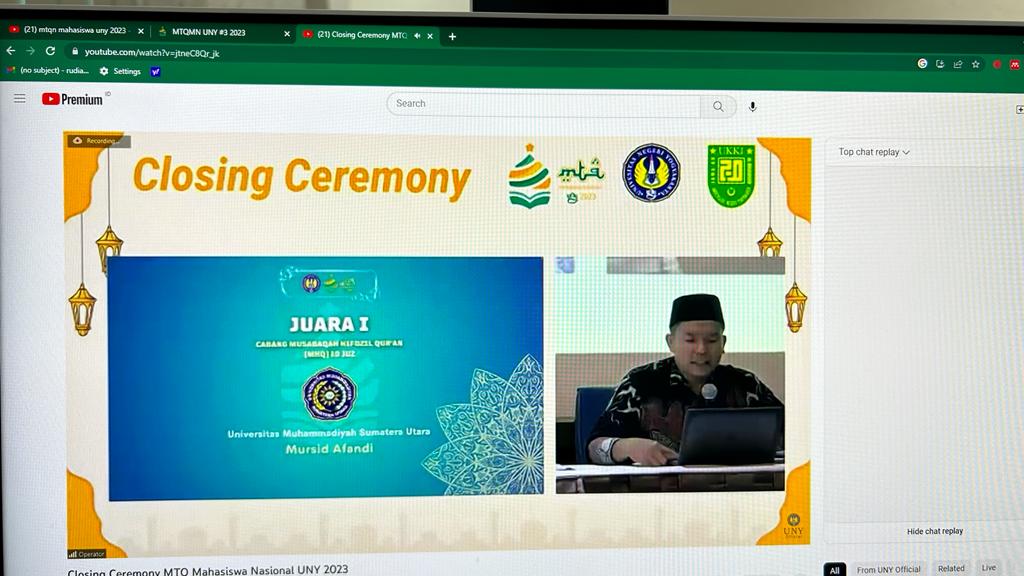 - Juara I Debat Ilmiah Al-Qur’an Bahasa Inggris: Putri Sandra Atqia (Fakultas Hukum) & Zhia Hazirah (Fakultas Teknik, Prodi Teknik Industri)