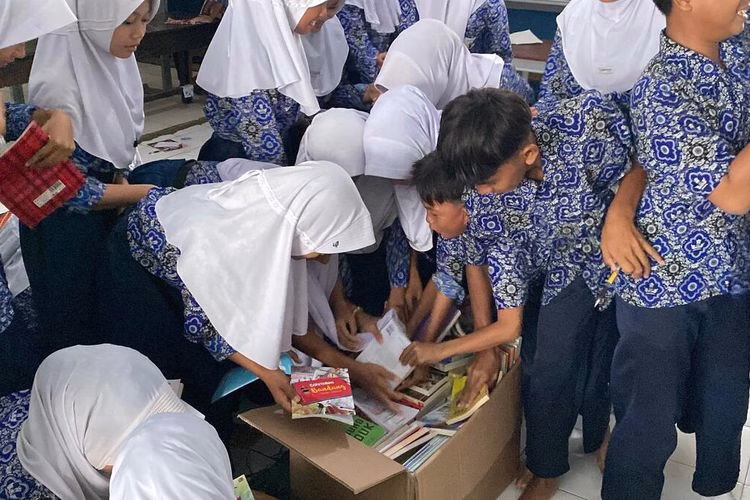 Anak-anak yang sebelumnya duduk diam tiba-tiba berdiri dan mengerumuni kardus tersebut, bahkan sebelum buku-buku itu sempat disusun di rak.
