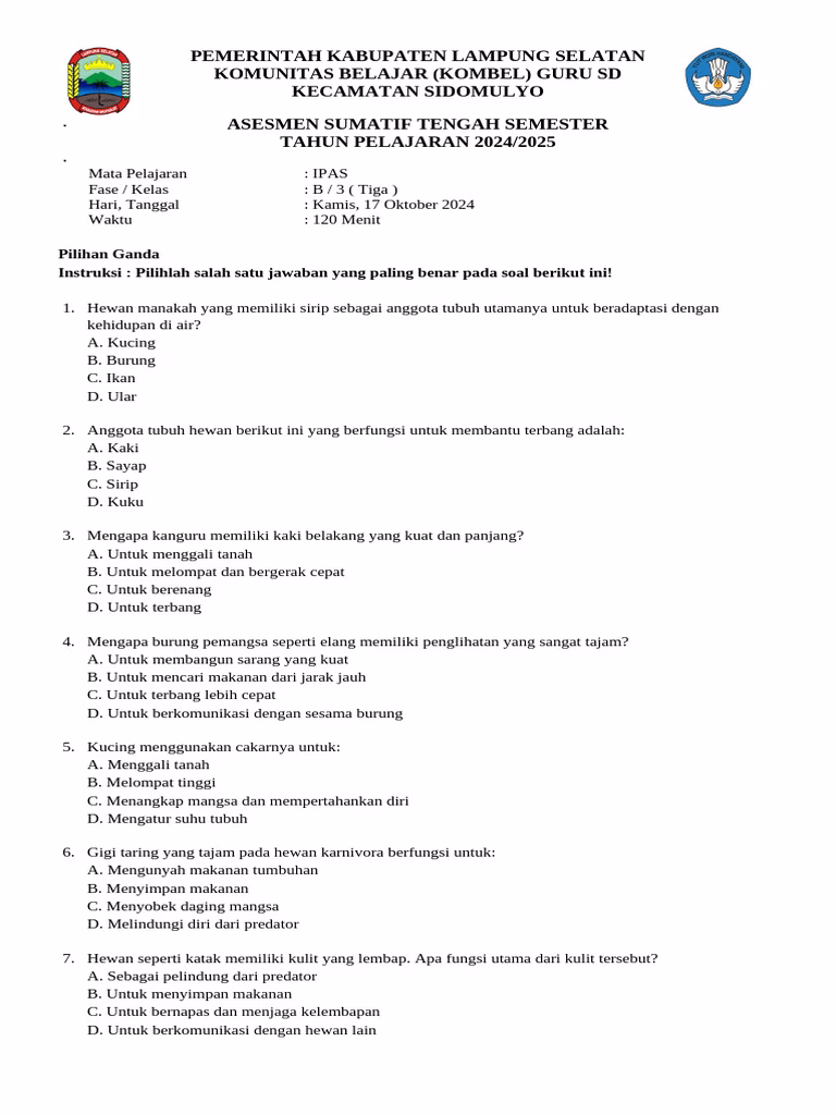 Dengan cara ini, siswa akan semakin terbiasa dan percaya diri. Belajar IPAS tidak harus sulit. Dengan latihan rutin menggunakan contoh soal IPAS kelas 3 semester 1, siswa dapat memahami materi lebih mudah dan menyenangkan. Soal-soal ini juga dapat digunakan sebagai acuan dalam pembelajaran mandiri di rumah maupun persiapan ujian sekolah.