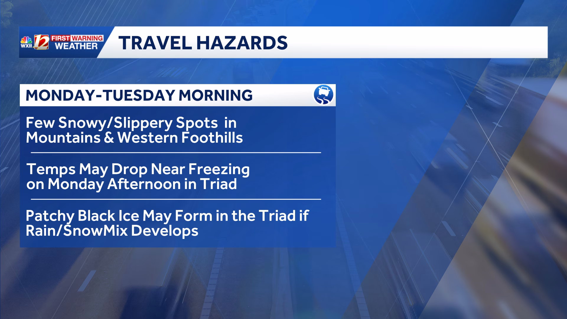 - Any rain and snow showers that may fall Monday morning may lead to black ice east of the Blue Ridge Parkway, with slippery travel most likely in the Mountains from morning snowfall.