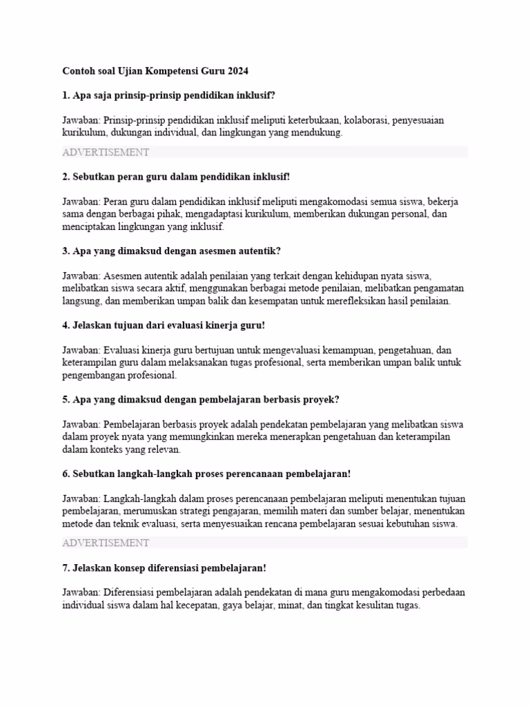 Melalui 40 contoh soal uji kompetensi guru, para pendidik bisa menilai kemampuan diri sekaligus memperbaiki area yang masih lemah. Kumpulan soal ini tidak hanya berguna untuk persiapan ujian, tetapi juga menjadi landasan meningkatkan kualitas profesionalitas guru dalam jangka panjang.